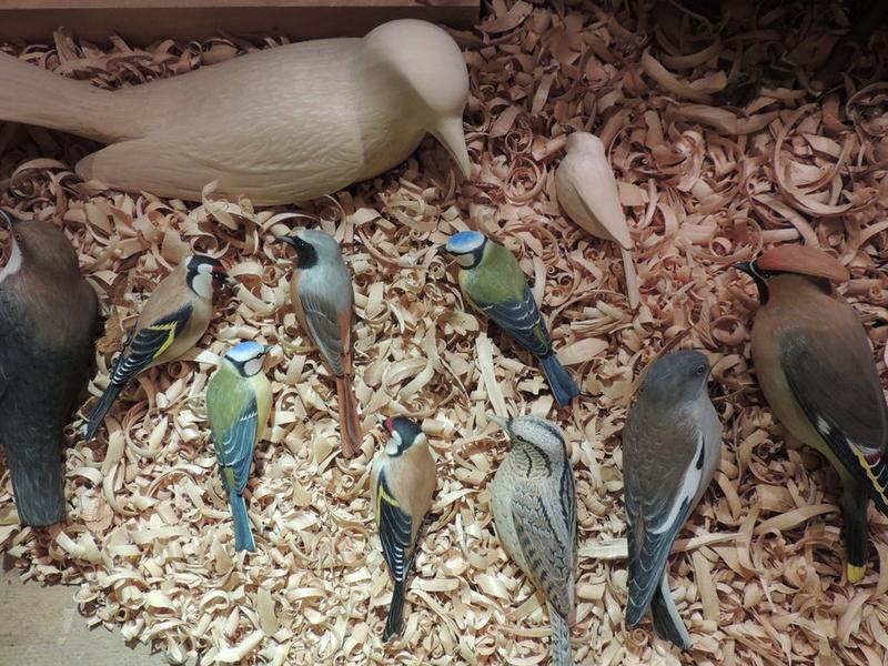 In stundenlanger Arbeit schnitze, schleife und bemale ich die Vögel mit wasserlöslichen Farben.