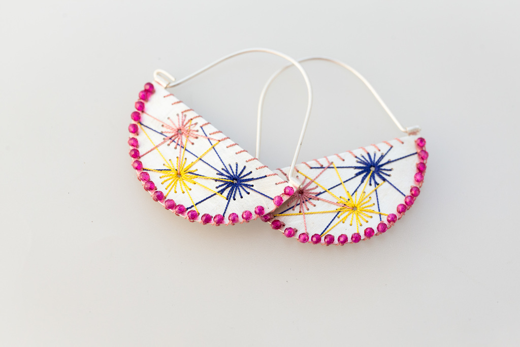 Bunte Fäden wickeln sich elegant um und über das Edelmetall. Kompliziert und doch verspielt. Drunter und drüber – so, wie das Leben. Mit diesen leichten und bunten Schmuckstücken ist man nicht zu übersehen. Jedes Schmuckstück ist ein Unikat und wird aus Sterlingsilber, Edelsteine und ausgewählten Fäden in sorgfältiger Handarbeit hergestellt.