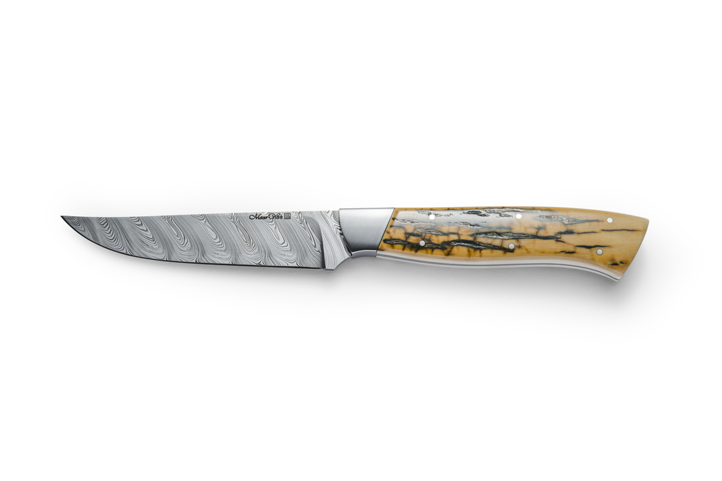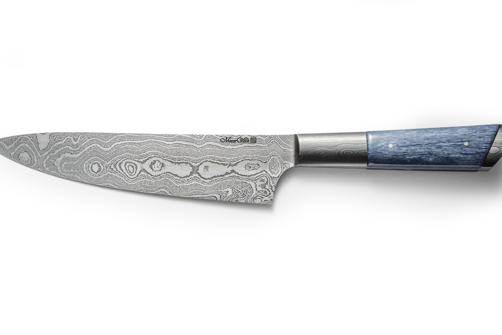 Wir verarbeiten für unseren Stahl ausschließlich hochwertigste Werkzeugstähle um einen Grund-Kohlenstoffgehalt garantieren zu können. Dieser ist die Voraussetzung für die Härtung der Klinge. Ausschlaggebend für beide Damaszenersorten ist jedoch ihre Maserung, die bei jeder Klinge anders aussieht. Sie ist nicht etwa künstlich aufgebracht durch Prägen, Gravieren oder ähnliche Verfahren, sondern zieht sich aufgrund der vielen Faltungen und der Anzahl der Lagen durch die ganze Klinge. Jede Klinge erhält so ihr eigenes "Gesicht".