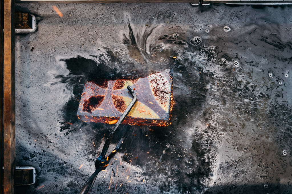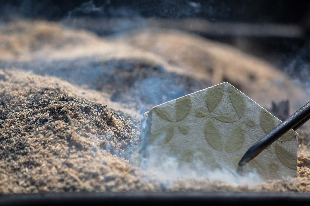 Following the 700-year-old Japanese Raku technique, Karak tile manufacture is reviving a dying sort of craftsmanship in its most complex form: when fired, each tile is removed from the furnace at a temperature of 800 to 900°C, covered in sawdust and then submerged in cold water. It is the strongly operating elementary forces that create the tiles’ unique character.